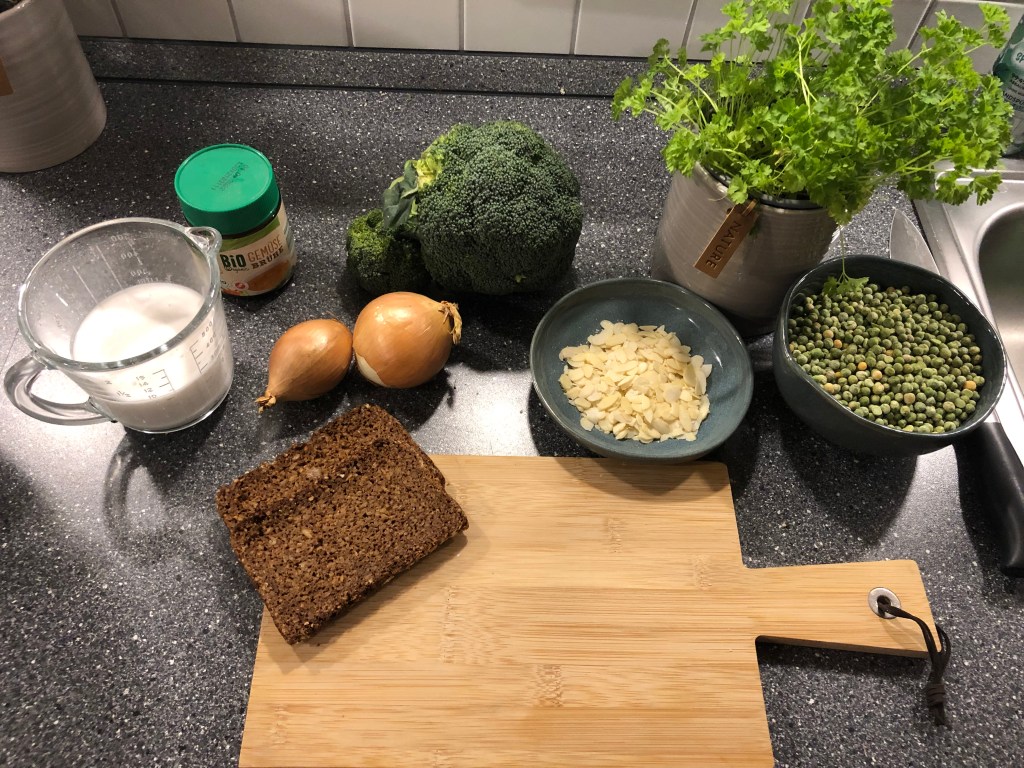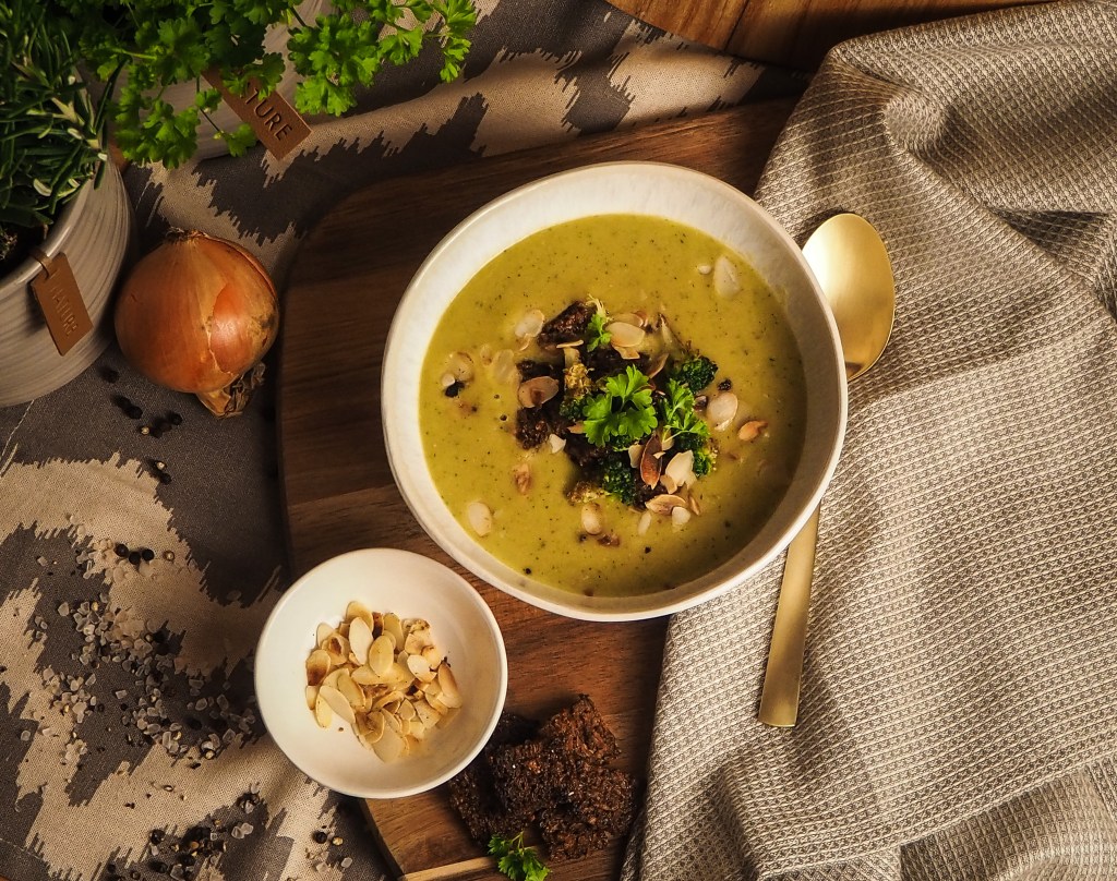- Danach auch die Mandelsplitter leicht in der Pfanne goldbraun anbraten und auf der Suppe mit dem Vollkornbrot und den Brokkoli Röschen garnieren.