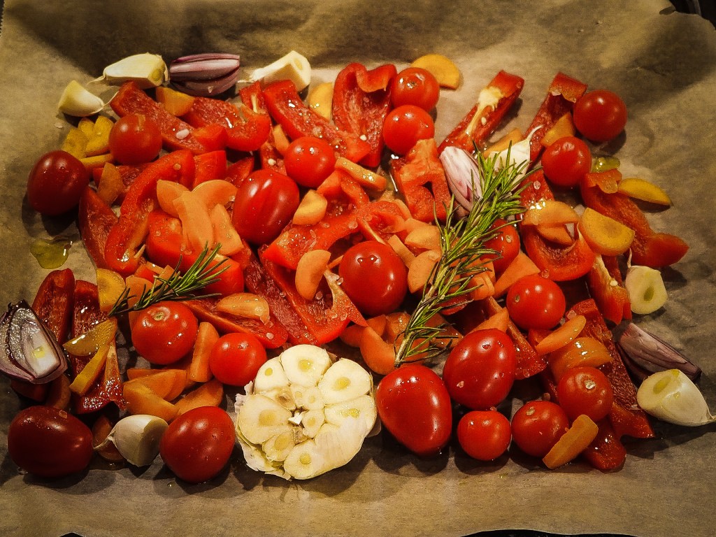 - Schneidet das Gemüse in kleine Stücke und verteilt alles sorgfältig auf einem Blech.