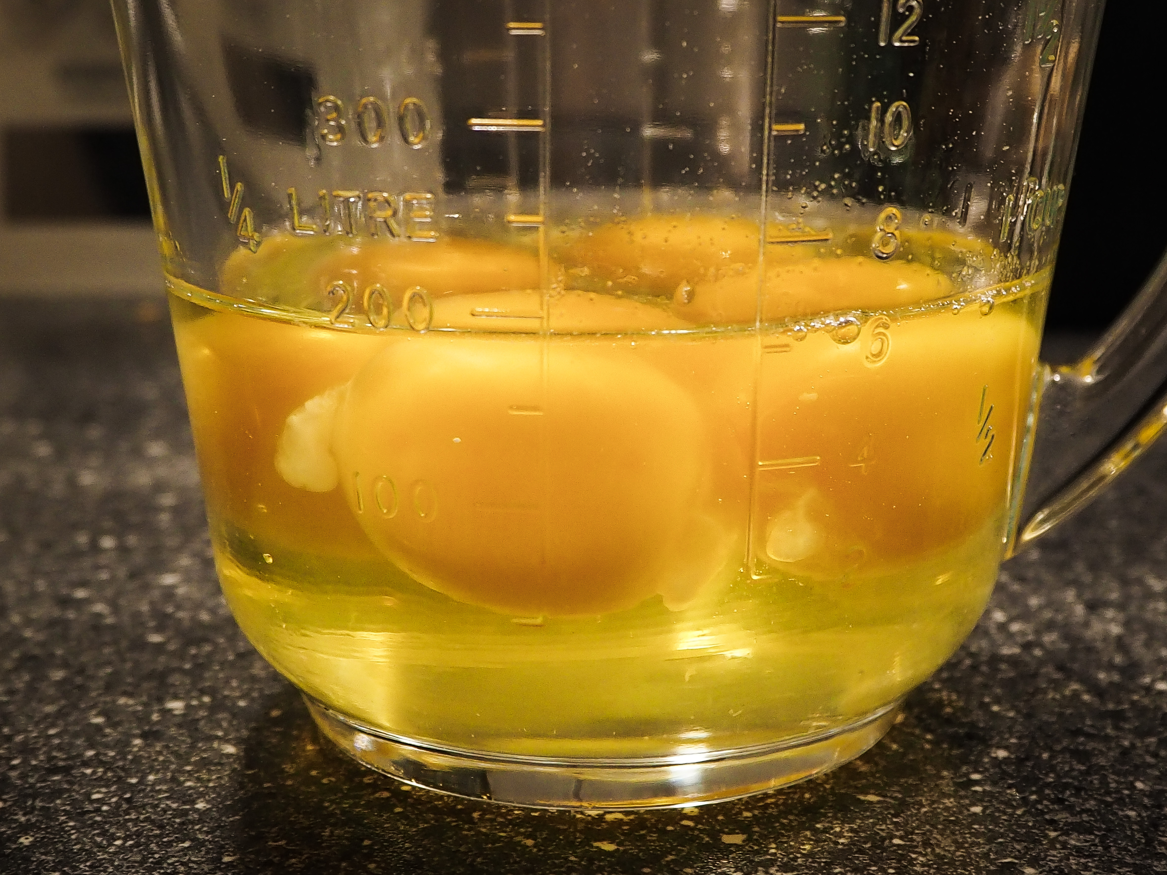 - Für den Teig siebt ihr das Mehl in eine Rührschüssel und gebt das Salz dazu. Messt mit einem Messbecher ab, ob die 4 Eier 200 ml ergeben, falls nicht, füllt mit Wasser bis auf 200 ml auf.