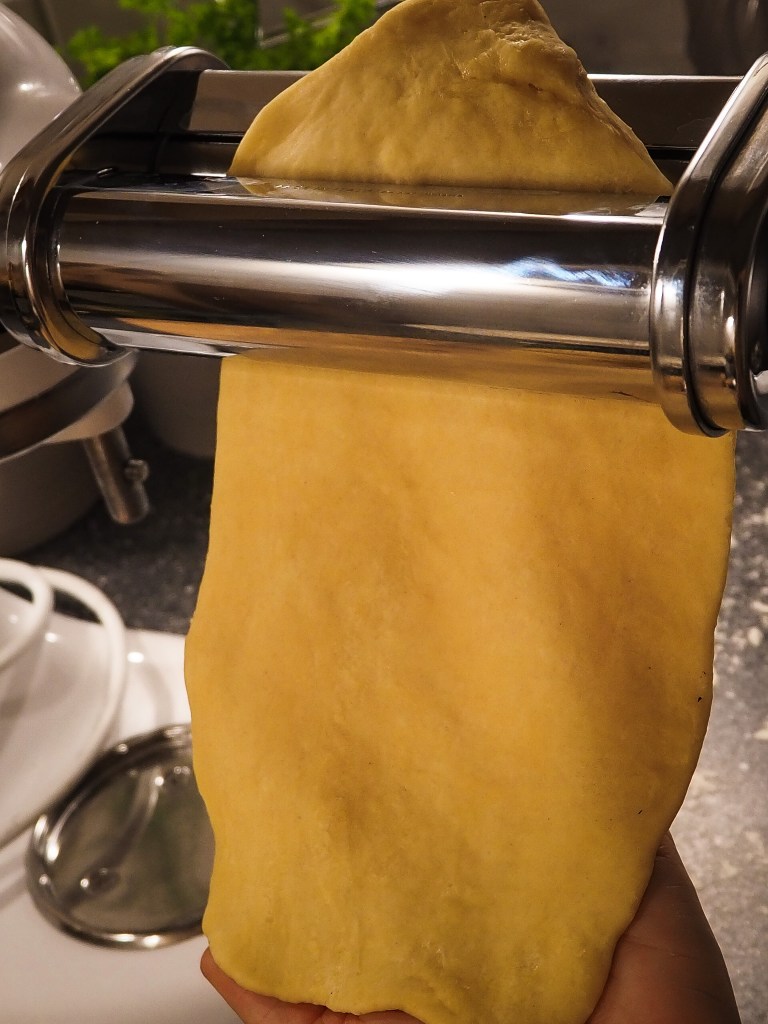 - Falls ihr eine Nudelwalze habt, gebt ihr die Teile nach und nach durch die Walze, bis sie etwa die gleiche Länge und Breite haben. Ein Nudelholz tut es natürlich auch.