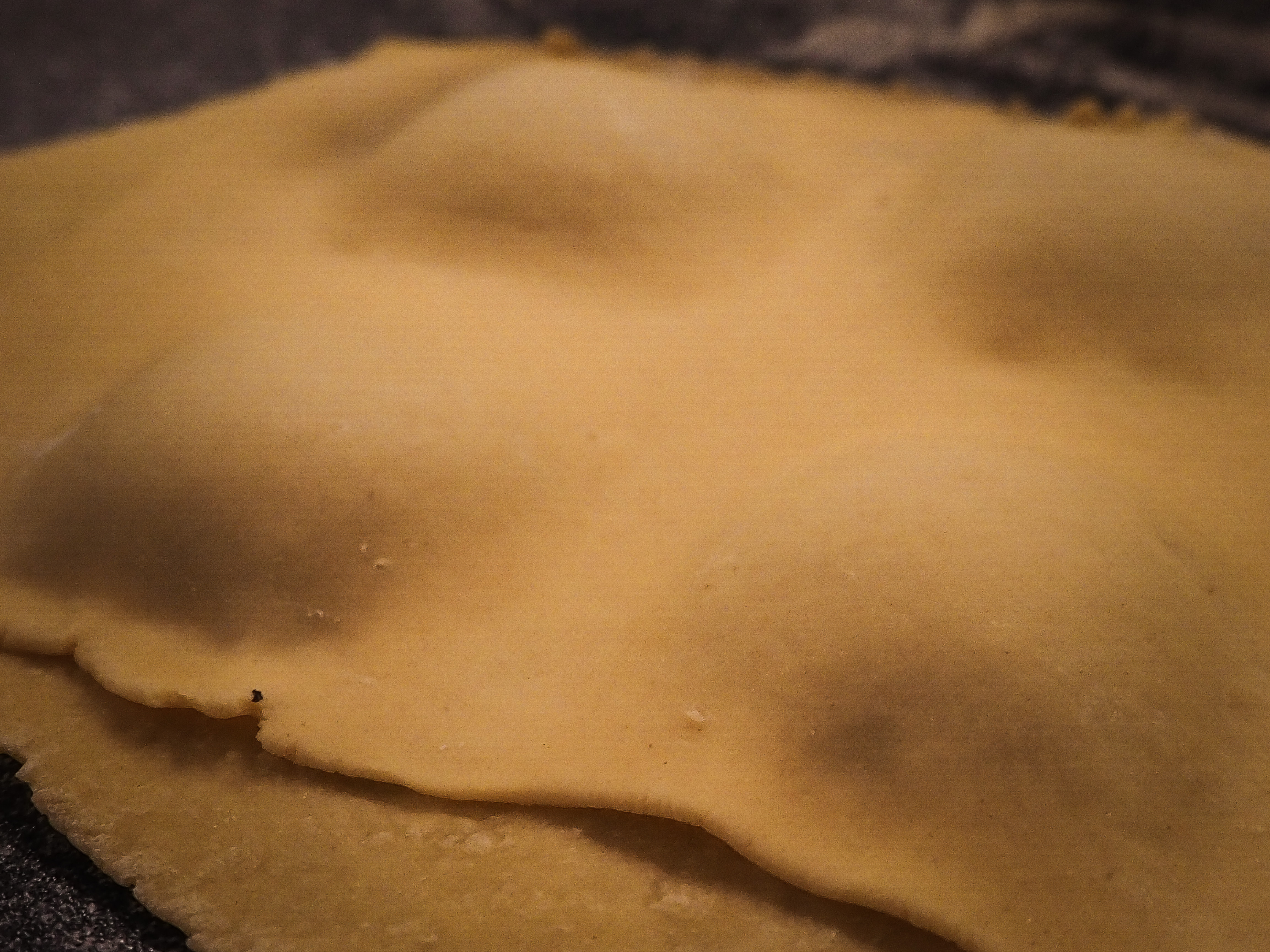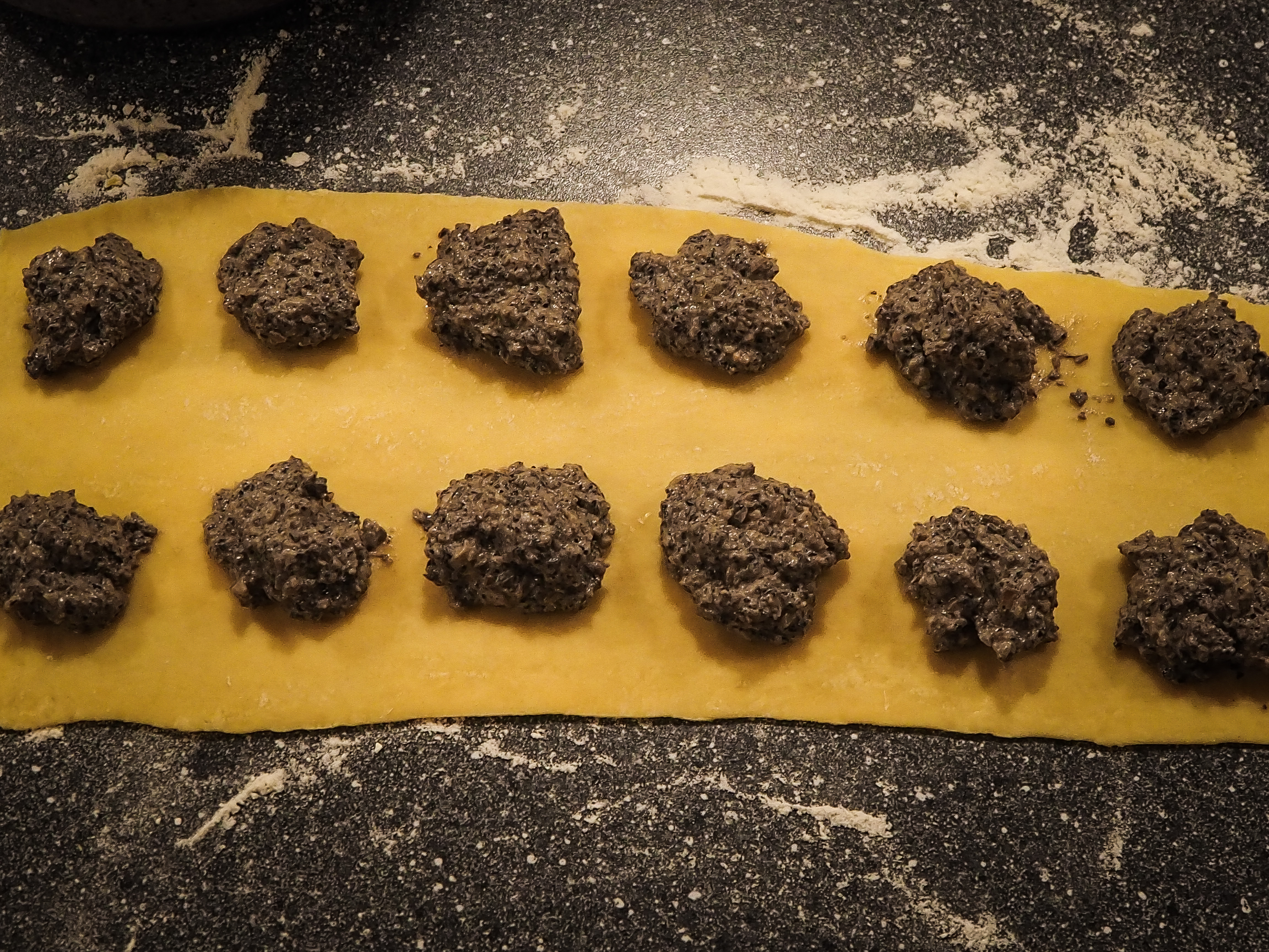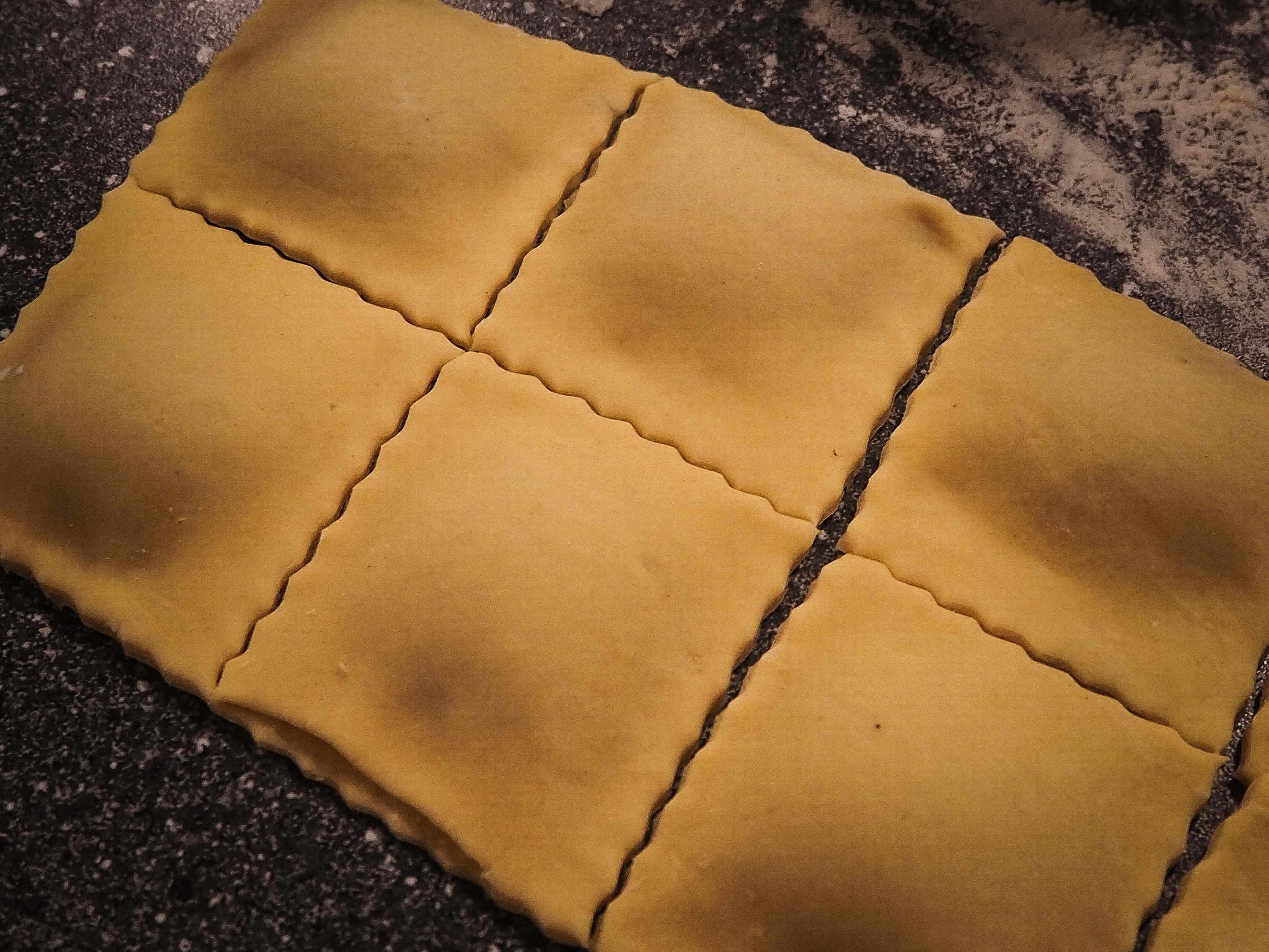 - Drückt die Maultaschen um die Füllung herum ordentlich zusammen und schneidet Sie mit einem Nudelrad in gleich große Stücke.