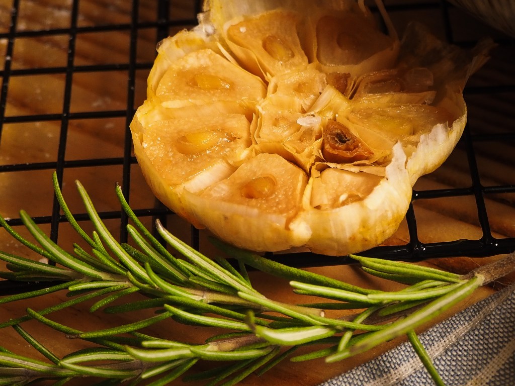 - Teilt die Knoblauchknolle in der Mitte und legt ihn mit aufs Blech. Die Gewürze und das Olivenöl über dem Gemüse verteilen und für 45 Minuten bei 150°C Ober-/Unterhitze backen.