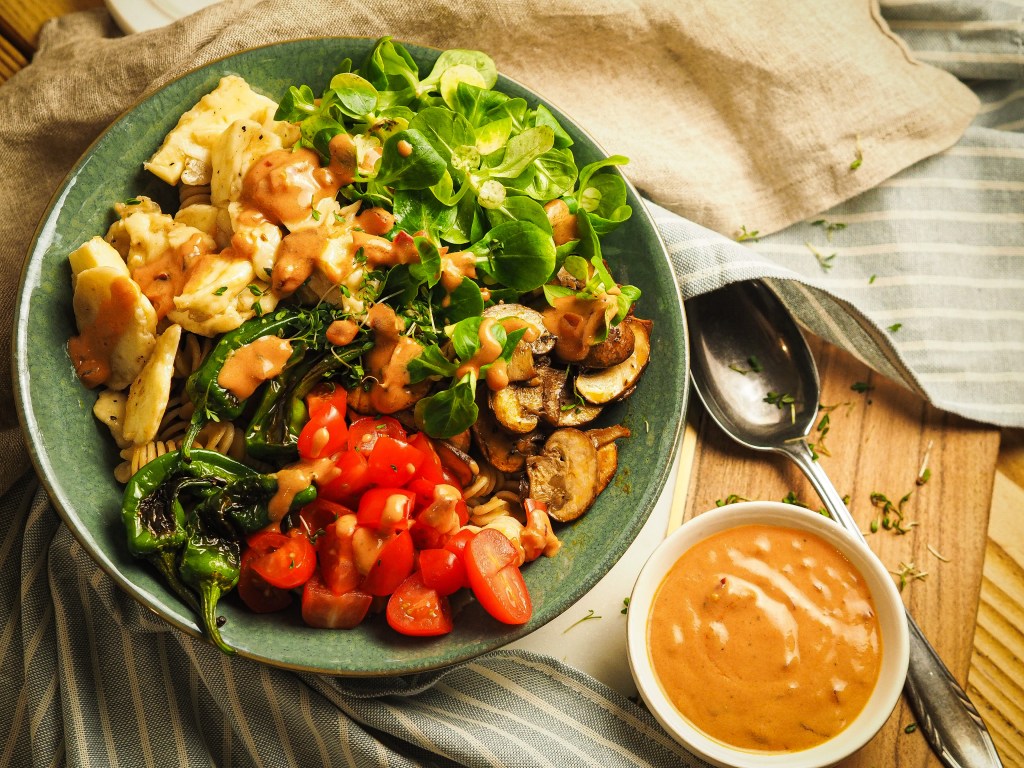 Diese Bowl hat als Grundlage Kichererbsen Fussili und somit einen hohen Proteingehalt und weniger Kohlenhydrate. Also perfekt nach dem ihr Sport gemacht habt und eure Muskeln nach Proteinen schreien um weiter zu waschsen.
